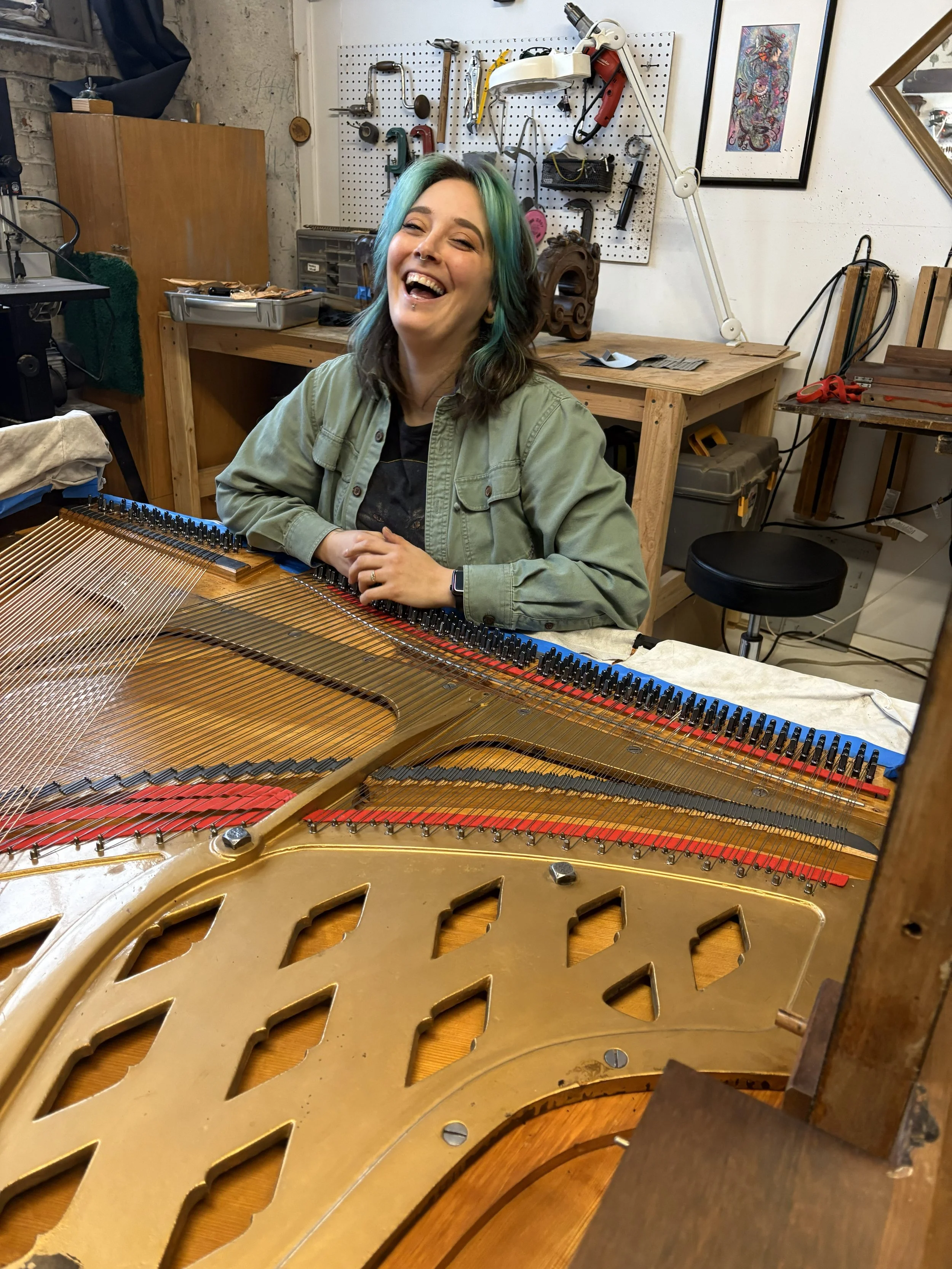 In 2025 Britney’s husband Matthew began working at Little Orchestra. Having met in 2013 at Classic Pianos, Matthew had already been working as a piano technician. In 2016 he pursued an accounting degree and CPA designation. Matthew now helps in the shop, specializing in key tops, finish repair and making furniture out of salvaged piano parts.