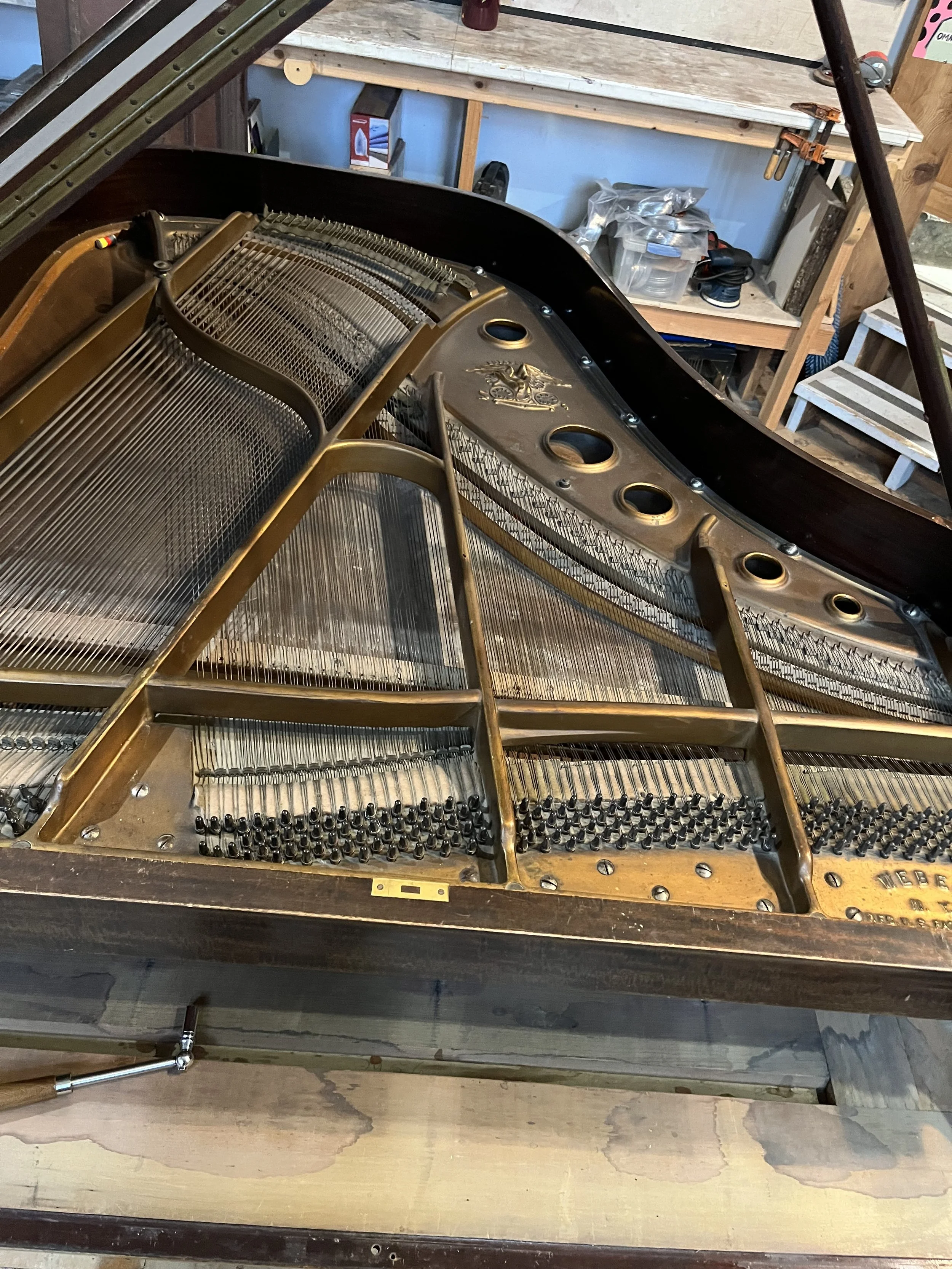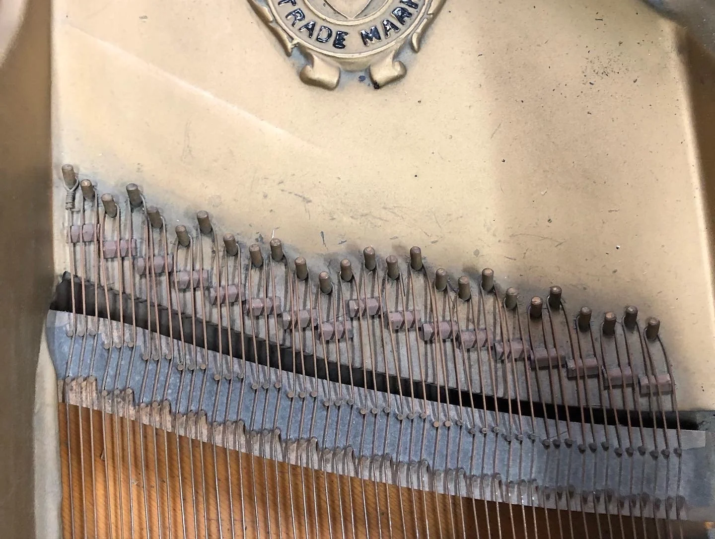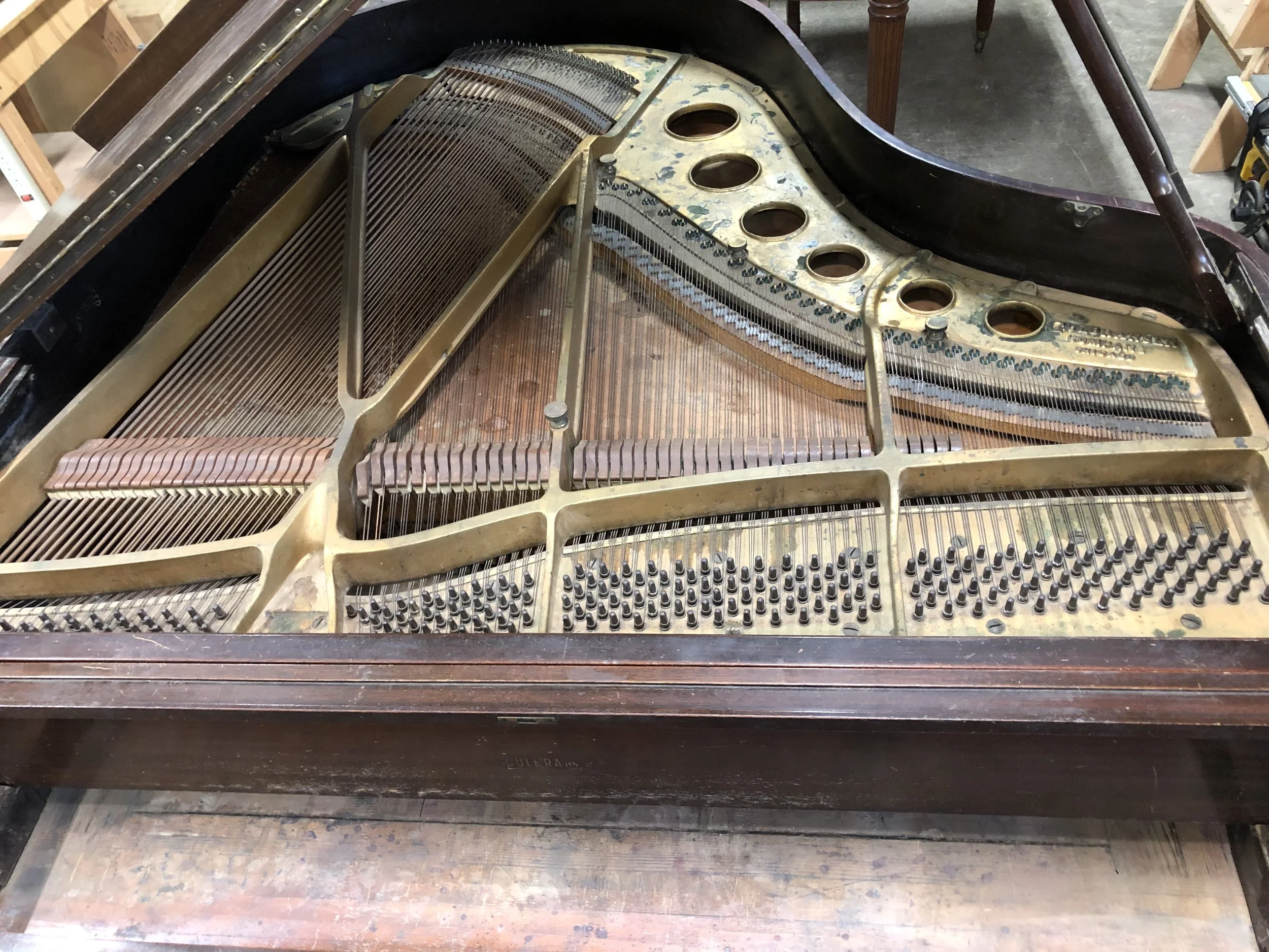 A close up of the treble section of the Gulbranson grand after rebuilding.