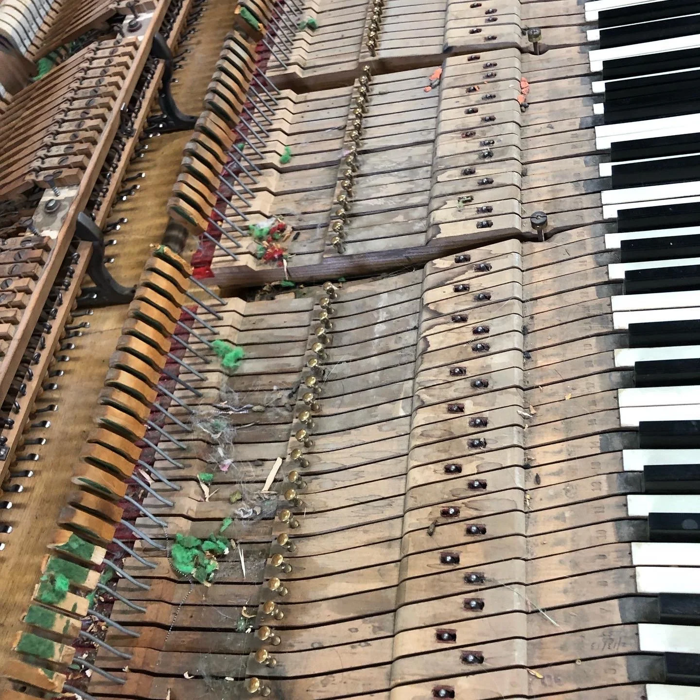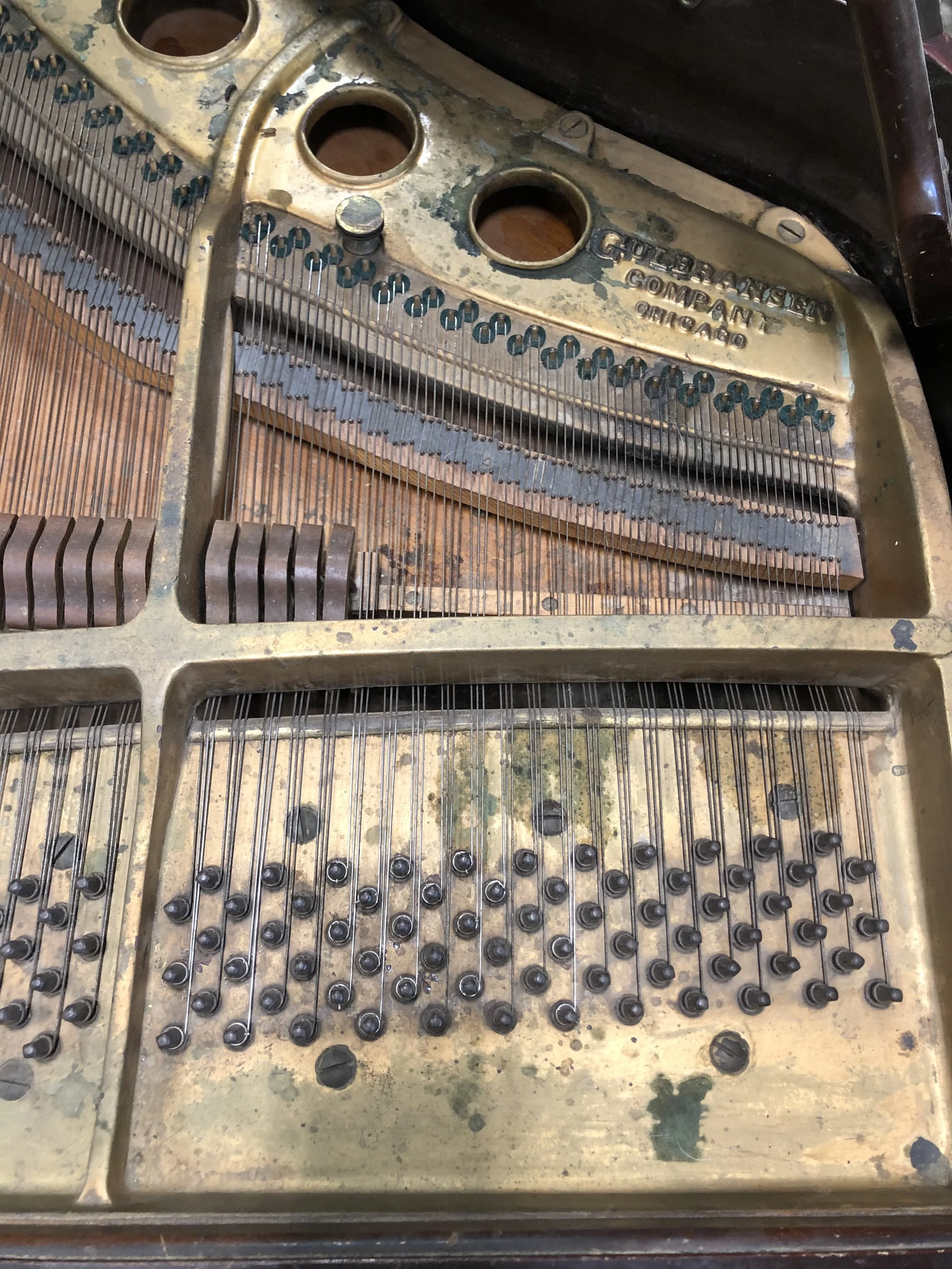 A close up of the treble section of the Gulbranson grand before rebuilding.